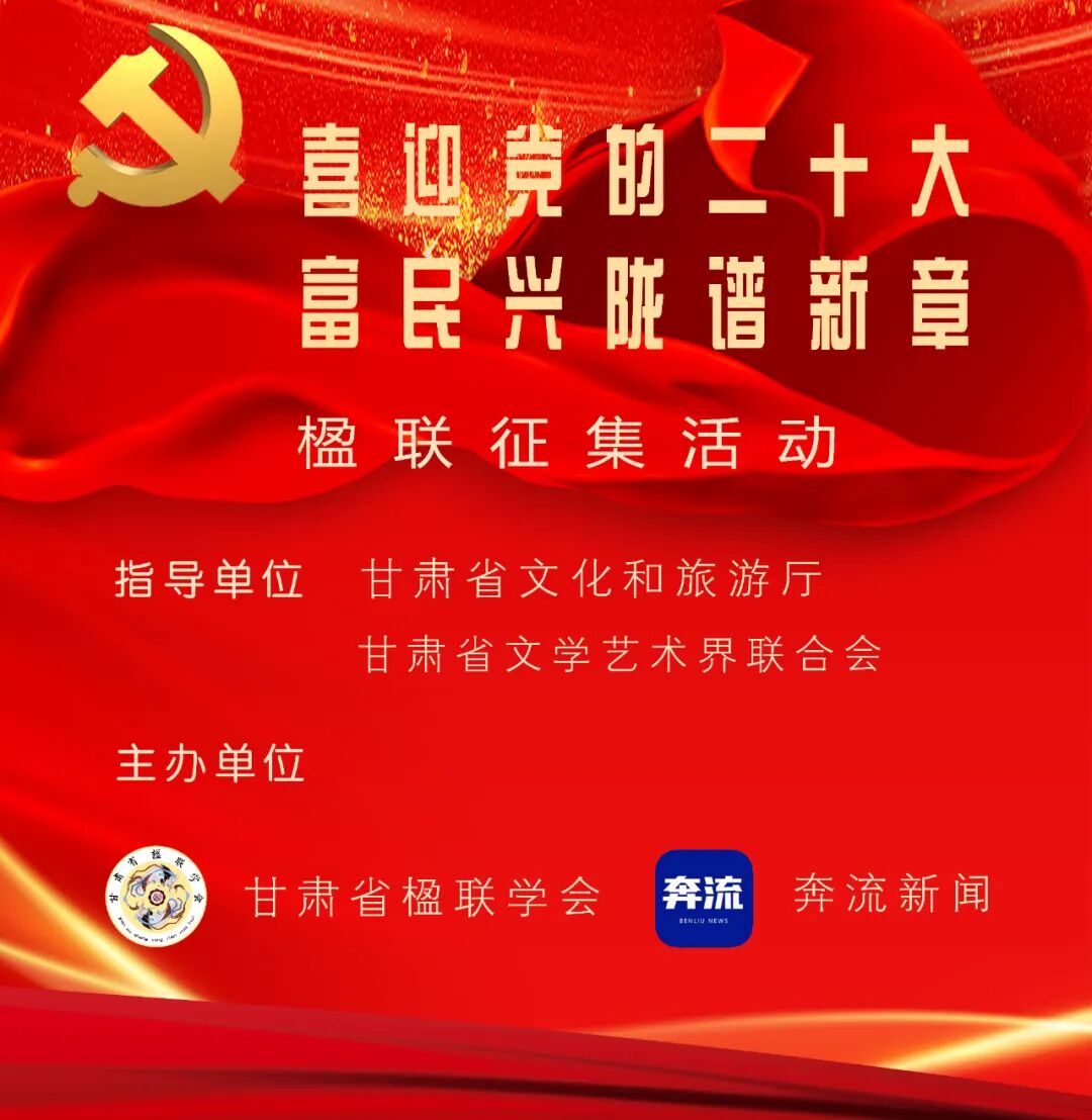 为喜迎【】胜利召开,深入贯彻落实甘肃省第十四次党代会精神,由甘肃省文化和旅游厅、甘肃省文学艺术界联合会指导,甘肃省楹联学会联合奔流新闻开展“喜迎【】·富民兴陇谱新章”楹联征集活动。活动自5月下旬开展以来,得到社会各界广泛关注,共收到来自全国18个省市作者投稿1100余副。因疫情影响,近期,甘肃省楹联学会组织有关专家在线完成初评、复评,并于日前进行线上终评,组织终评委王家安、廖海洋、徐维强、曹兴章、吴生春、仇金选、高全铭完成终评。评审环节全程匿名进行,经过评委三轮评审,共从300副终评入围作品中确定20副优秀作品。